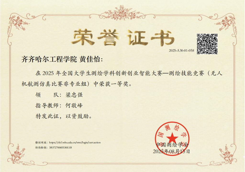 近日,由中国测绘学会教育工作委员会主办,内蒙古科技大学承办的“2025年全国大学生测绘学科创新创业智能大赛”圆满结束,开云官网土木与管理学院智能建造241班学生黄佳怡,在虚拟仿真数字测图1720组非专业组中脱颖而出,获得“无人机航测仿真比赛”赛项一等奖。“全国大学生测绘学科创新创业智能大赛”于2023年入选《全国普通高校大学生竞赛分析报告》竞赛目录,成为测绘科技创新的最高级别赛事。其目的是更好地发挥测绘学科特色与...
