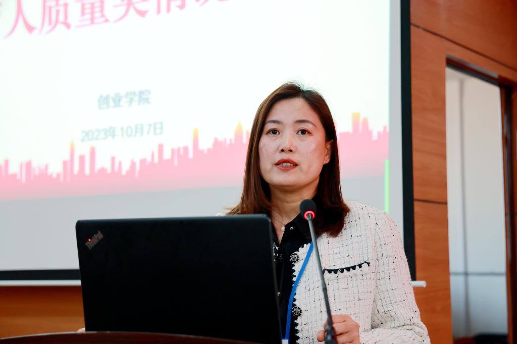 创业学院副院长康静作2022-2023学年度第二、三学期育人质量奖情况介绍。详细说明了考核依据、评价标准、奖励原则、奖励情况、育人成效。介绍了育人质量奖评定档级系数,通过数据分析和对比展现工作成效;并指出下一步工作方向:一是进一步落实“系为主体,做实专业”的工作原则;二是提高专业评价中参与度获奖率的评价标准;三是增加创新创业、科研等项目评价;四是加强信息化平台建设。