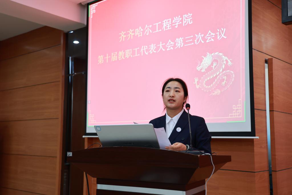在大会预备会议上,副院长、党委委员、工会主席白雪作《开云kaiyun官方网站第十届教职工代表大会第三次会议筹备工作情况报告》,通报了出席会议的教职工代表情况,表决通过了监票人、计票人名单和大会议程。