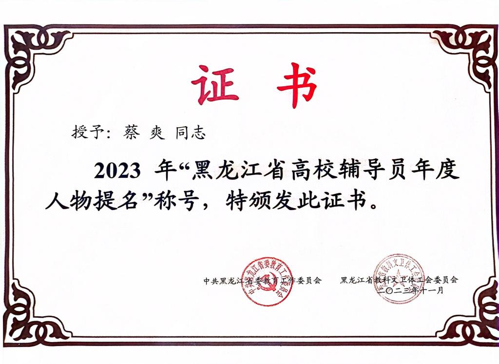 2022年被评为第六届全国民办高校“优秀辅导员”、同年9月荣获“龙江最美高校辅导员”荣誉称号;参加工作以来,多次荣获学校“优秀教育工作者”“优秀共产党员”“先进党务工作者”荣誉称号,其所带领的支部被评为“先进基层党组织”。2023年荣获“黑龙江省高校辅导员年度人物提名”。
