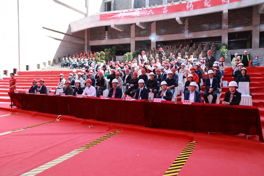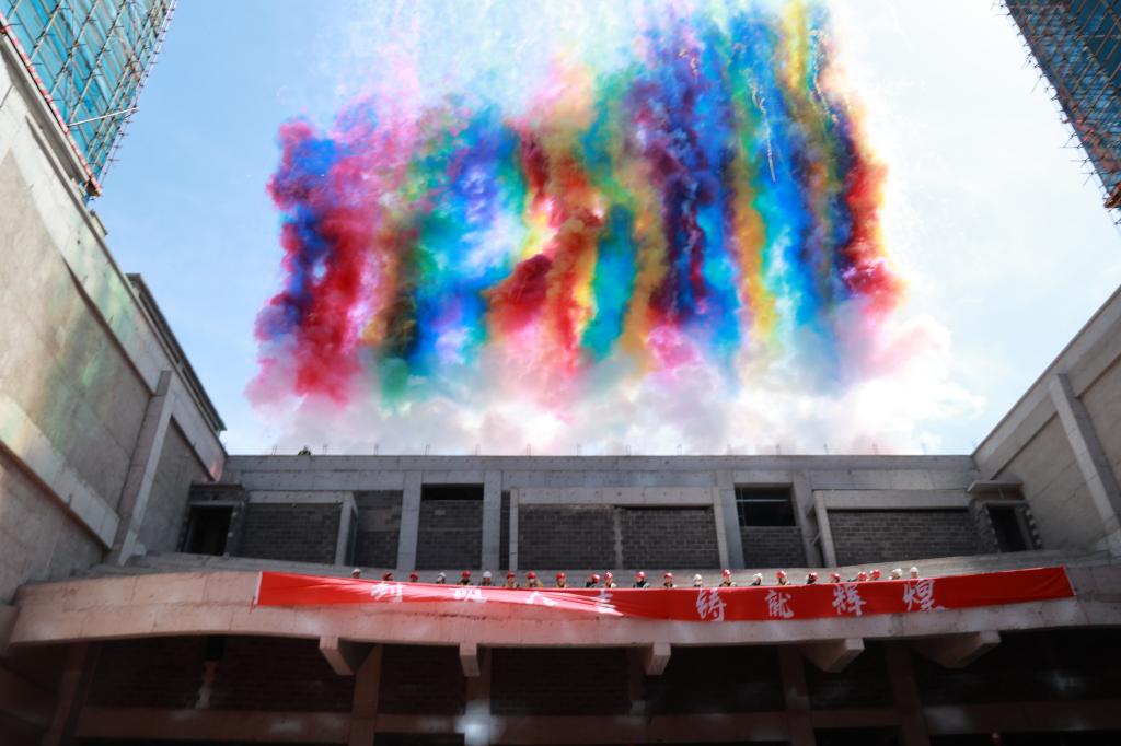 现场礼炮齐鸣,掌声阵阵,共同庆祝北区校园一期建筑封顶。