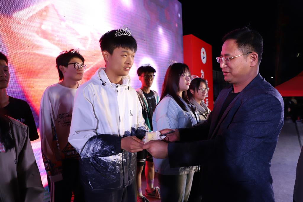 曹勇安进行抽奖,被抽中的幸运学生上台领奖,现场气氛热烈。