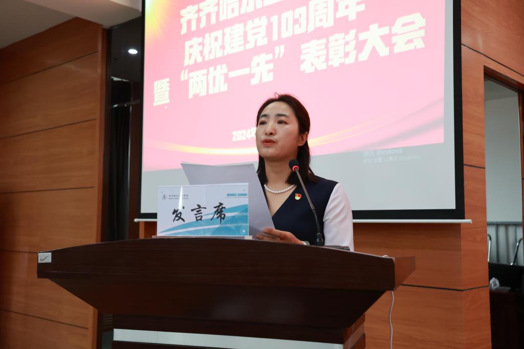 郭伟东强调,荣誉属于过去,未来任重道远。全体党员师生要始终牢记党的宗旨使命,深入学习贯彻习近平新时代中国特色社会主义思想和党的二十大精神,深刻领悟“两个确立的”决定性意义,增强“四个意识”、坚定“四个自信”、做到“两个维护”,坚定信心谋发展、砥砺奋进求跨越,引领身边的共产党员和师生群众以更加昂扬的斗志、更加务实的作风,持续推进审核评估进程,不断开创学校教育事业高质量发展新篇章,以更加优异的成绩向建党103周年献礼。