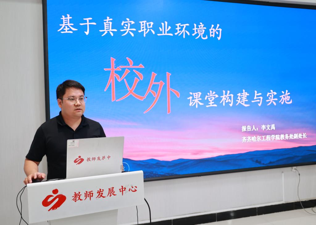 学校教务处李文禹作《基于真实职业环境的校外课堂构建与实施》报告。报告从校外课堂的逻辑起点、校外课堂的运行模式、校外课堂的实施保障三方面出发,对校外课堂的校企共育实验班、东方红专班、校园北区进行了详细阐述。表示,校外课堂是在真实职业环境中,以工作流程为主线,按照工作标准,遵循教育教学基本规律,有目的、有计划、有组织实施课业的场所。