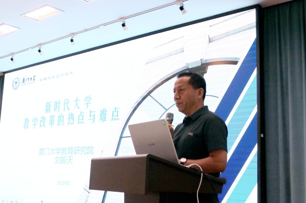刘振天以《新时代大学教学改革的热点与难点》为题作报告,介绍了教学的重要性,表示体制改革是关键、教学改革是核心、转变观念是先导。指出,质量是高等教育的生命线,人才培养是主旋律,教学是人才培养的主渠道;教学是学术、技术、艺术,教学必须改革,要做到教学有法、而无定法、贵在得法,方能促进教师成长,学生成材。