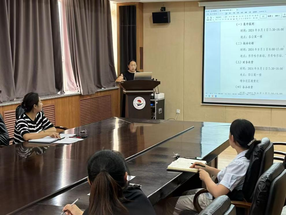 陈景鑫对迎新工作进行了总结和部署,对各部门开学前期所做的工作给予充分肯定。她指出,迎新工作是学校的一项重要工作,关系到学校的形象和声誉,各部门在迎新工作中要注重细节,做到精心组织、精准服务;要加强对迎新工作人员的培训和指导,提高服务水平和工作效率;要加强与新生和家长的沟通和交流,及时解决学生在入学过程中遇到的问题和困难;在学校南北区调度过程中,要提高安全防范意识,确保迎新工作安全有序进行。希望各部门进一步提高责任意识和服务意识,团结协作,以饱满的热情和高度的责任感投入到迎新工作中,为新生营造一个温馨、和谐、美好的学习、生活环境。