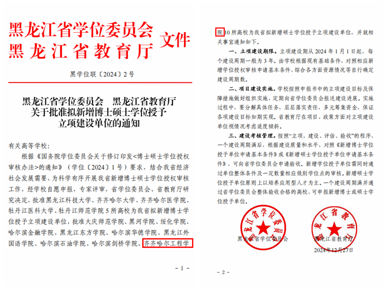 12月27日,黑龙江省学位委员会、黑龙江省教育厅下发了《关于批准拟新增博士硕士学位授予立项建设单位的通知》(黑学位联[2024]2号),开云官网成功获批硕士学位授予立项建设单位。
