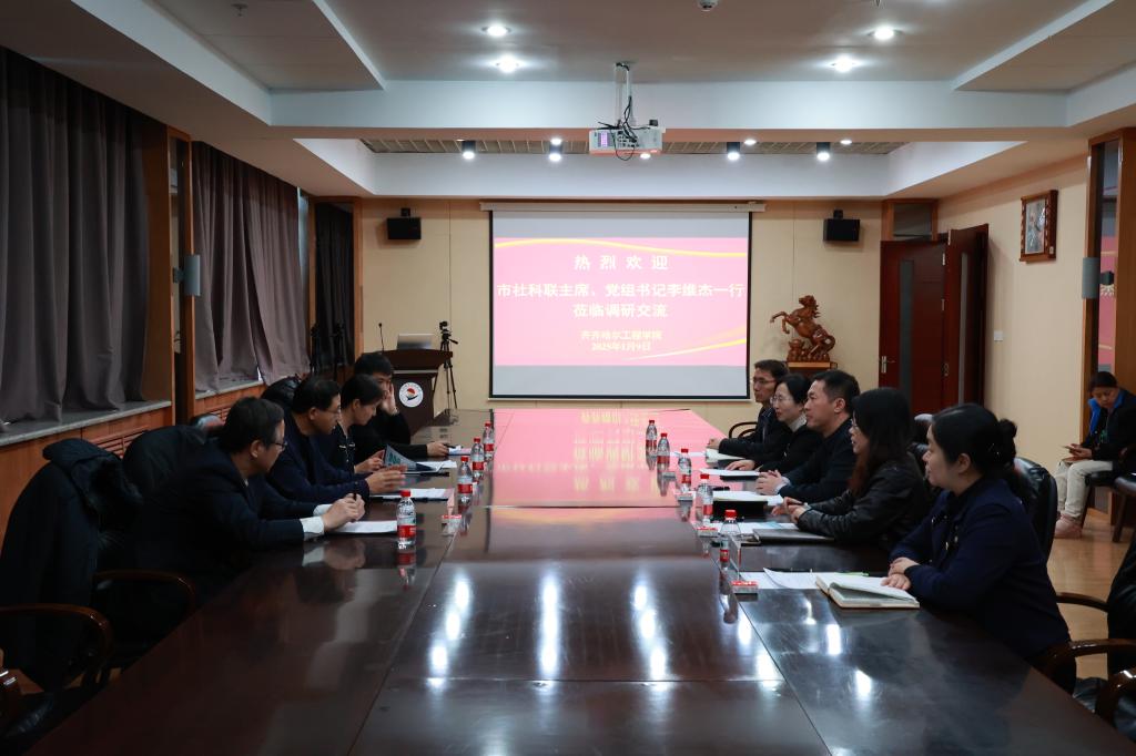 1月9日下午,齐齐哈尔市社科联主席、党组书记李维杰,副主席、党组成员王微,副主席、党组成员刘新伟、市哲学社会科学规划办周浩一行来校调研交流。学校党委书记郭伟东、副院长张静、科研处处长张平、马克思主义学院院长赵婷婷、科研处宋庆永陪同调研并参加座谈会。