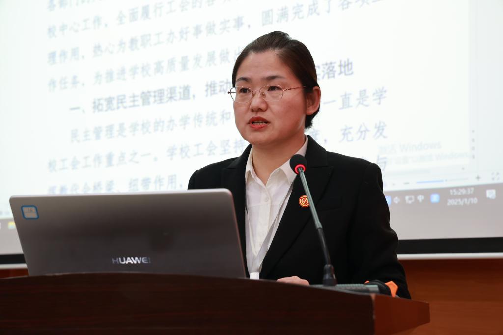 白雪作2024年度工会工作总结。2024年,学校工会以习近平新时代中国特色社会主义思想为指导,贯彻落实党的二十大、二十届二中、三中全会精神,在市总工会和学校党委的领导下,在学校行政和各部门的大力支持下,深入贯彻《中华人民共和国工会法》,紧紧围绕学校中心工作,拓宽民主管理渠道,推动校务公开落实落地;维护教职工合法权益,热心为师生办好事做实事;开展各种形式的活动,丰富教职工业余文化生活;积极联系对外宣传工作,全面履行工会的各项职能,圆满完成了各项工作任务,为推进学校事业高质量发展做出了积极贡献。