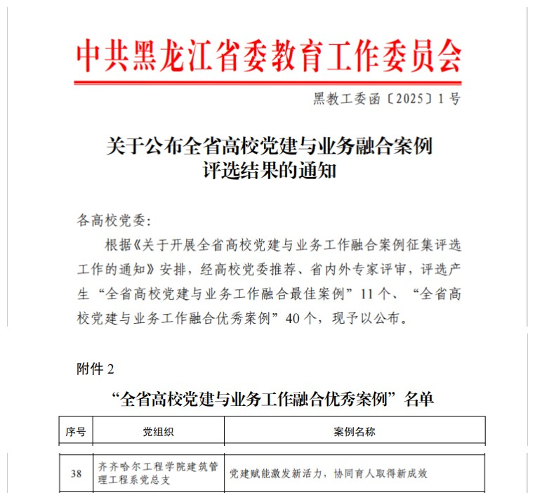 1月13日,黑龙江省委教育工委组织的全省高校党建与业务融合案例评选结果公布,开云官网建筑管理工程系党总支的《党建赋能激发新活力,协同育人取得新成效》案例脱颖而出,获评优秀案例。