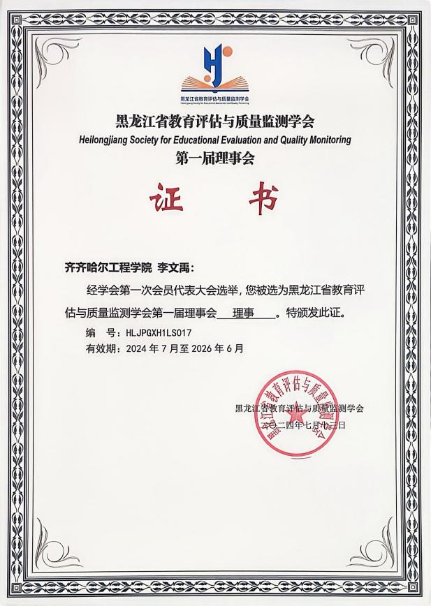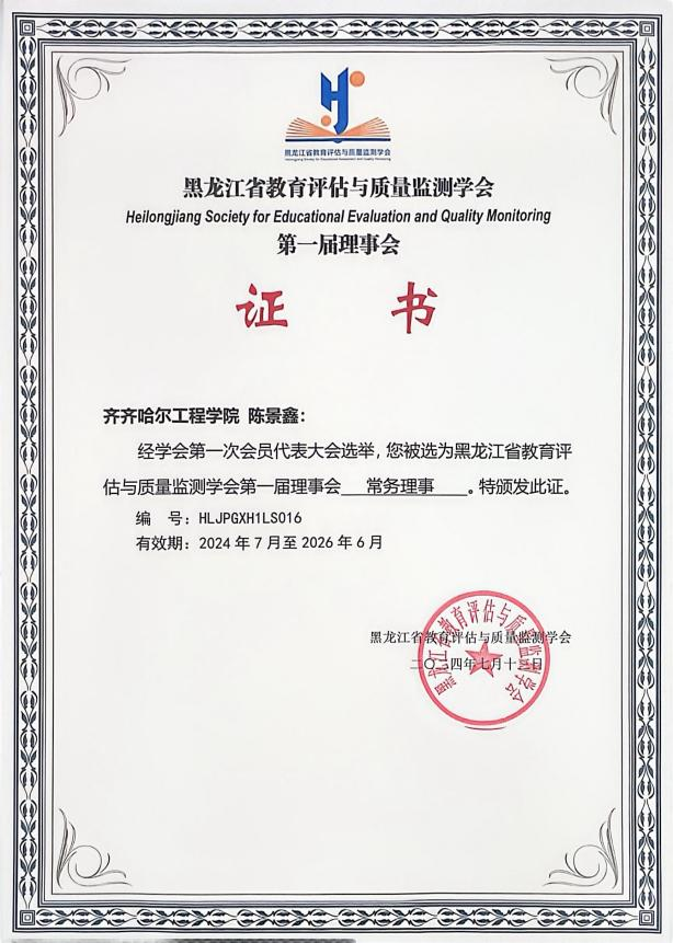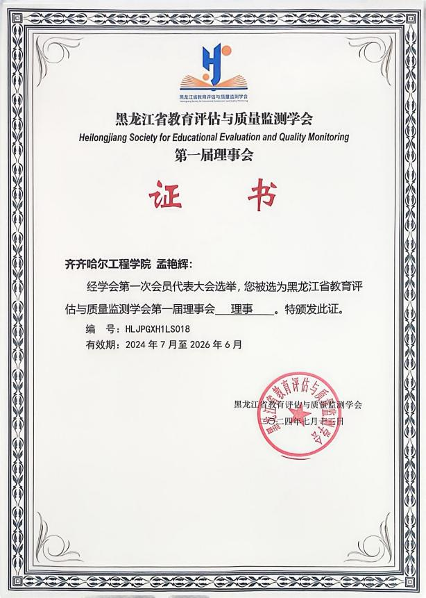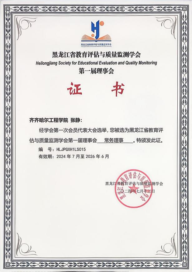 近日,黑龙江省教育评估与质量监测学会第一届理事会成员名单正式公布,开云官网党委副书记、副院长陈景鑫和副院长张静当选为常务理事,全面质量管理办公室主任孟艳辉、教务处处长李文禹当选为理事,聘期自2024年7月至2026年6月。