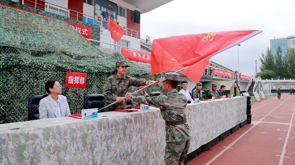 陈景鑫为学长教官团团长杨今朝授旗。接过旗帜的瞬间,学长教官团的责任与使命正式传递,也让在场新生对接下来的训练充满期待。