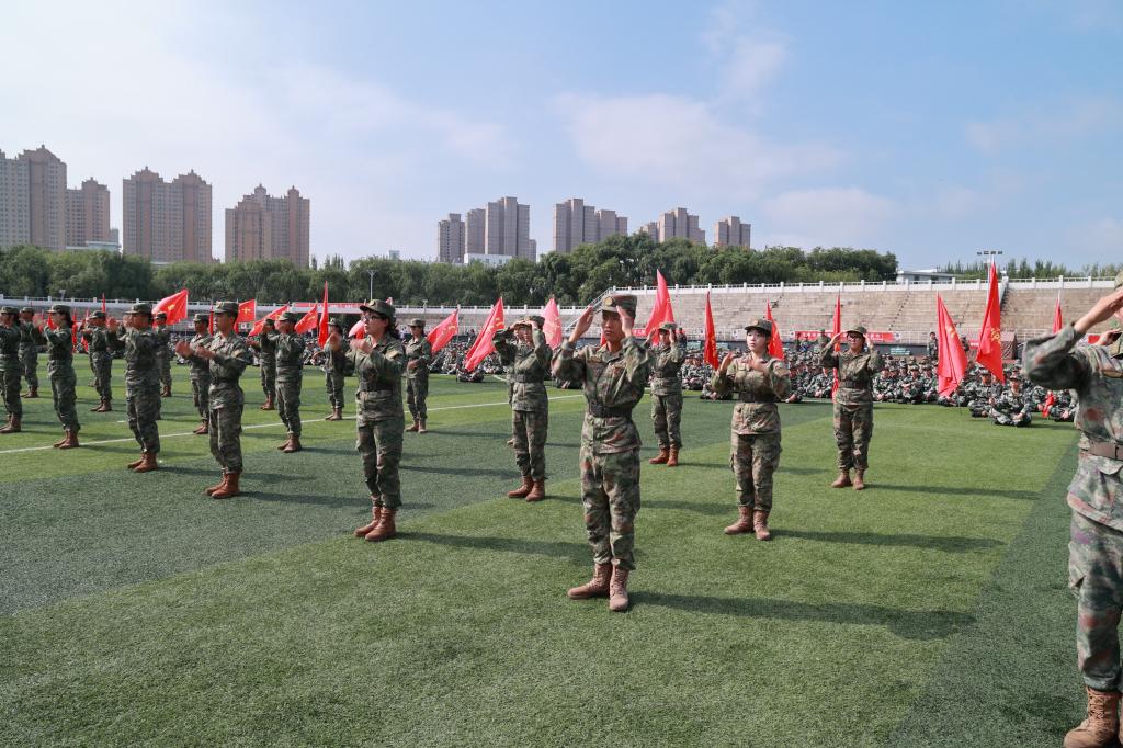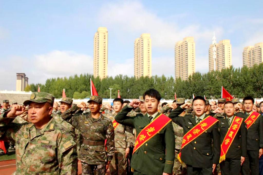 孙晓芳带领全体退役大学生重温退役誓词。他们将用军人的担当为军训注入力量,也激励着新生以更高标准要求自己。