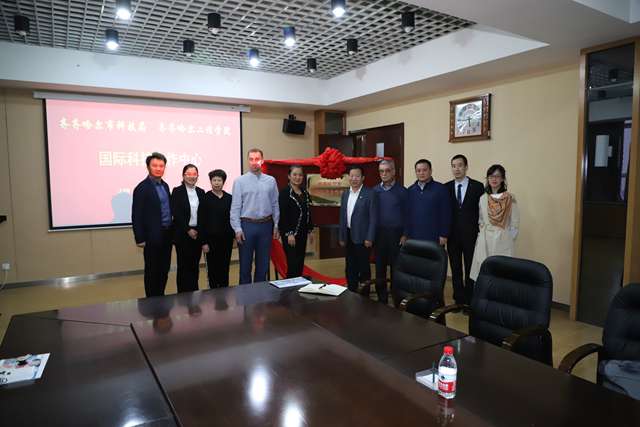 座谈会最后,那君喆局长、宋铁群副主任、曹然彬院长共同为落户我院的“齐齐哈尔市国际科技合作中心”揭牌。那君喆局长指出:建立齐齐哈尔市国际科技合作中心,目的是创造一个合作交流平台,进一步促进齐齐哈尔高校在科技创新、留学合作等方面的国际交流,实现科技合作、资源共享。