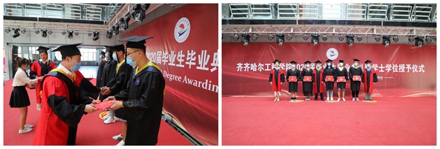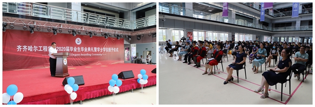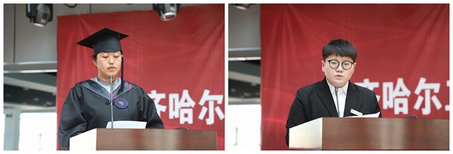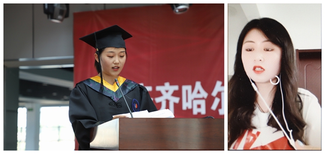 建筑工程系土木162班张亚男、机电工程系汽服162班姜媛祺,分别代表2020届学士学位获得者在典礼上发言,向辛勤付出的学校领导和老师们表示衷心感谢并致以崇高敬意,并动情地回顾入校以来各方面获得的成长进步及深切感受,表示绝不辜负母校的培养,以优秀的业绩彰显学校的形象。