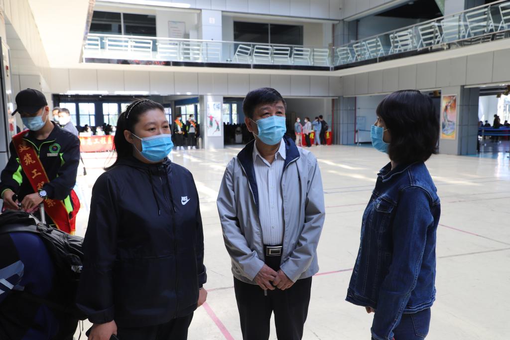 党委书记李敏义等学校领导来到现场慰问工作人员,关心返校学生相关安排。