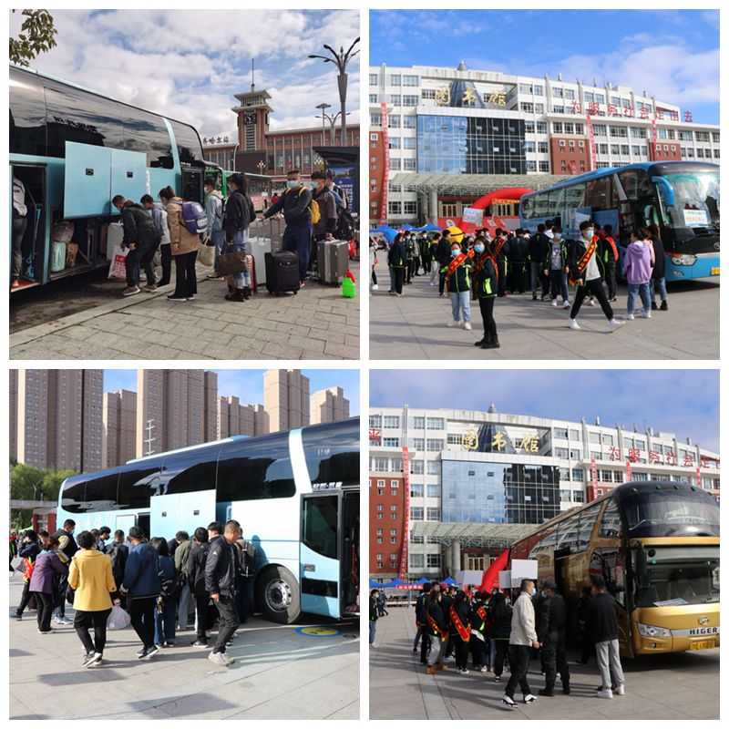 学校分别在齐齐哈尔火车站安排3台大客车、9名学长,在火车站南站安排2台大客车、7名学长,在飞机场安排1台中巴、4名学长,根据提前掌握的信息,从早7点至晚6点,多次往返迎接新生。