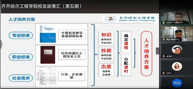 在校生嘉宾2017级的孟令韩同学和2019级的周晶同学,就专业学习相关问题与校友学长互动交流,探讨专业的发展趋势与发展前景,借鉴校友学长的学习实践及其工作经验。大家认为学校的“三级办学,系为主体,做实专业”适应社会发展,人工智能、大数据、信息共享已融入各行各业,尤其要珍惜大学生活,学好专业知识,规划好自己的人生路,让自己的人生更加绚丽多彩!