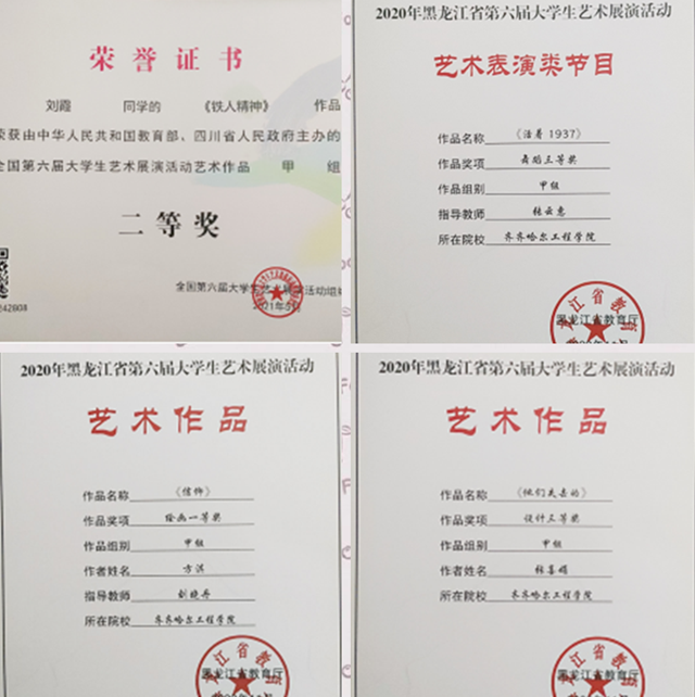 近日,由黑龙江省教育厅举办的2020年黑龙江省第六届大学生艺术展演活动圆满结束。经过省教育厅组织的专家评审、网上公示,学校最终获得4项奖。其中信息工程系刘晓丹老师指导学生方淇的《信仰》荣获绘画一等奖,信息工程系刘晓丹老师指导学生刘霞《铁人精神》荣获摄影一等奖,信息工程系刘晓丹老师指导学生张喜娟的《他们失去的》荣获设计三等奖,校团委指导教师张云惠指导的《活着1937》荣获舞蹈三等奖。张云惠、刘晓丹两位老师荣获“优秀指导教师奖”。其中,刘霞同学的《铁人精神》荣获全国第六届大学生艺术展演活动艺术作品甲组二等奖。
