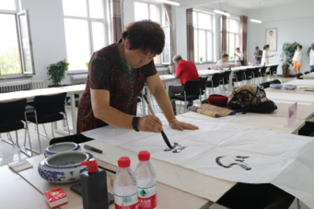 随后,书法家们走进图书馆二楼210自修室,在准备好纸墨笔砚的书桌上恣肆挥洒,泼墨留字。