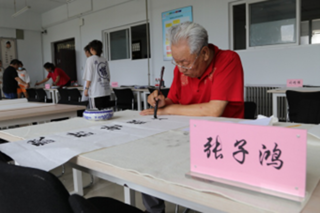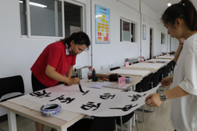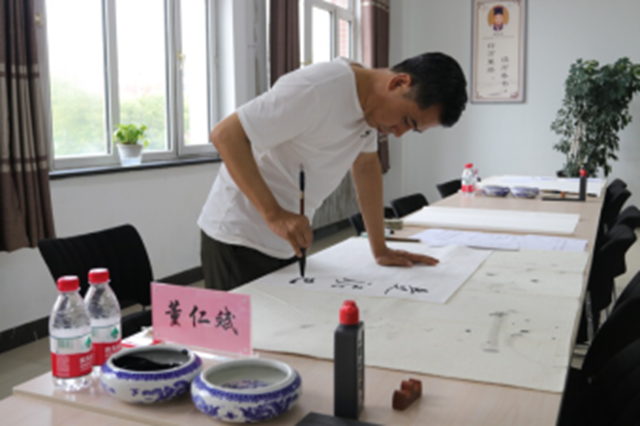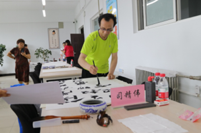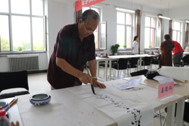 书法家们围绕着学校的教育理念,或隶书或行书或草书,笔墨酣畅,韵味十足,引得在场的师生赞叹不已。