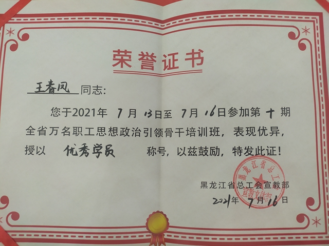 本次培训会上,学校两位参训教师均获得黑龙江省总工会授予的第十期全省万名职工思想政治引领骨干培训“优秀学员”荣誉称号。
