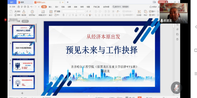 2000届法律专业校友、内蒙古木森水淼生态治理有限公司总经理嘉宾郝道龙以《预见未来与工作抉择》为题,对未来十年经济形势分析预见,谈了未来十年工作和创业抉择的思路,科技类企业、资源竞争、服务类行业、乡村振兴有强劲发展,为学弟学妹择业提供借鉴。