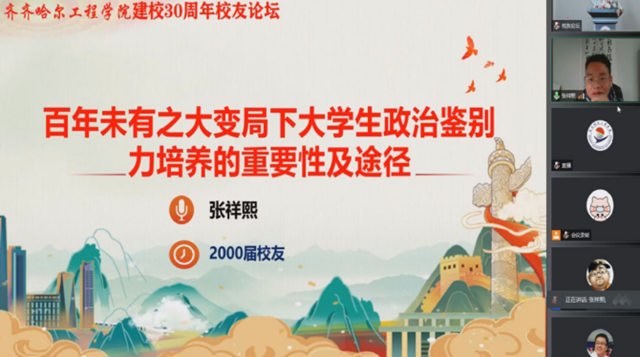 2000届英语专业校友、江西师范大学东南亚研究中心主任张祥熙,以《百年未有之大变局下大学生政治鉴别力培养的重要性及途径》为题分享。从中美结构性矛盾切入,讲述如何理解政治鉴别,对政治事件的真伪怎么看,政治立场的选择怎么办。倡导大家学会感恩,培养感恩之心,在思想上给予启迪。