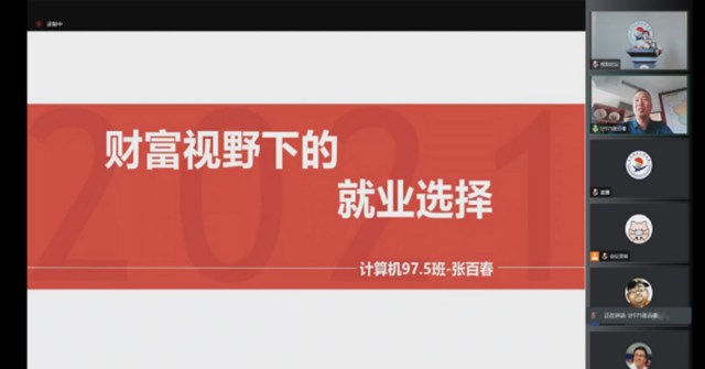 2000届计算机应用专业校友、北京百纳有为科技有限公司总裁张百春,以《财富视野下的就业选择》,重点从人工智能打击下的职业分析了择业形势,将大城市与小城市,大公司与小公司,行来与职业,全才与专才,收入与成长,打工与创业进行全面理性科学的对比,并提出就业建议。
