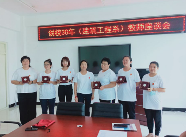 建筑系召开创校30年部门教师座谈会,陈景鑫主任为获得建校30周年纪念章的教师颁发礼盒,获得纪念章的教师为宋兴蕾、赵玖香、李俊、李智慧、李莹莹和李月凤。陈景鑫主任对获得纪念章的教师表示祝贺,感谢他们为学校倾力奉献,见证了学校发展历程。