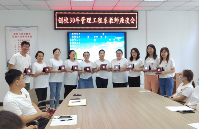 管理工程系全体教师在2#2209会议室召开“创校30年管理工程系教师座谈会”,由系主任陈景鑫为工作10年以上教工颁发银质纪念章。