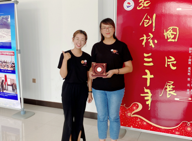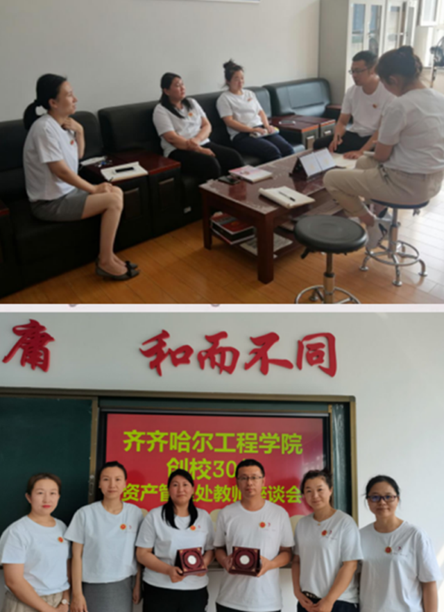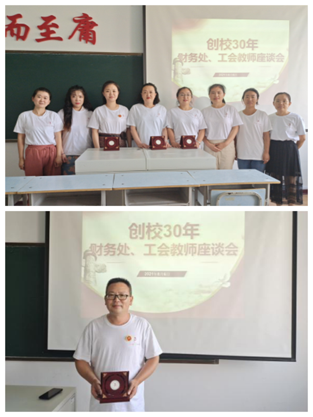 资产管理处全体教师召开创校30年教师座谈会,同时对部门两位在学校工作10年以上的杨鹏老师和赵新荣老师颁发创校30周年银质纪念章。