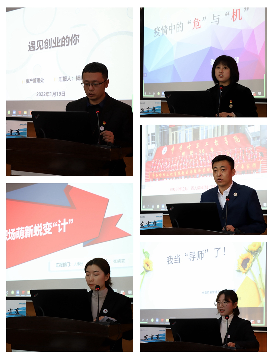 在评委团代表张莹老师宣读大会基本规则后,继续教育部孙娱芯以《疫情中的“危”与“机”》为题,基础部于壮以《课程的力量》为题,人事处张晓雯《职场萌新蜕变“计”》为题,资产管理处杨鹏以《遇见创业的你》为题,全面质量管理办公室周爽以《我当“导师”了》为题,分别代表所在部门分享了案例故事,畅谈收获与成长、经验与教训,进而总结与反思工作,并提出改进思路和努力方向。