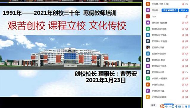 1月23日,创校校长、理事长曹勇安教授在学校图书馆601报告厅主会场历时6小时进行创校30年寒假教师培训。九个线上分会场的教职工收听收看了这场题为《艰苦创校 课程立校 文化传校》的专题讲座。