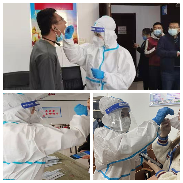 她来到核酸采集地点,在社区临时搭建的简易帐篷内换上防护服后,立即开始了核酸检测采样工作。当时室外温度为零下十度左右,她认真地为居民采集核酸。采集核酸后必须一人一消,她的手冻得通红麻木已没有知觉,防护面屏上也挂满了霜花,但她没有叫苦叫累,更没有退缩。