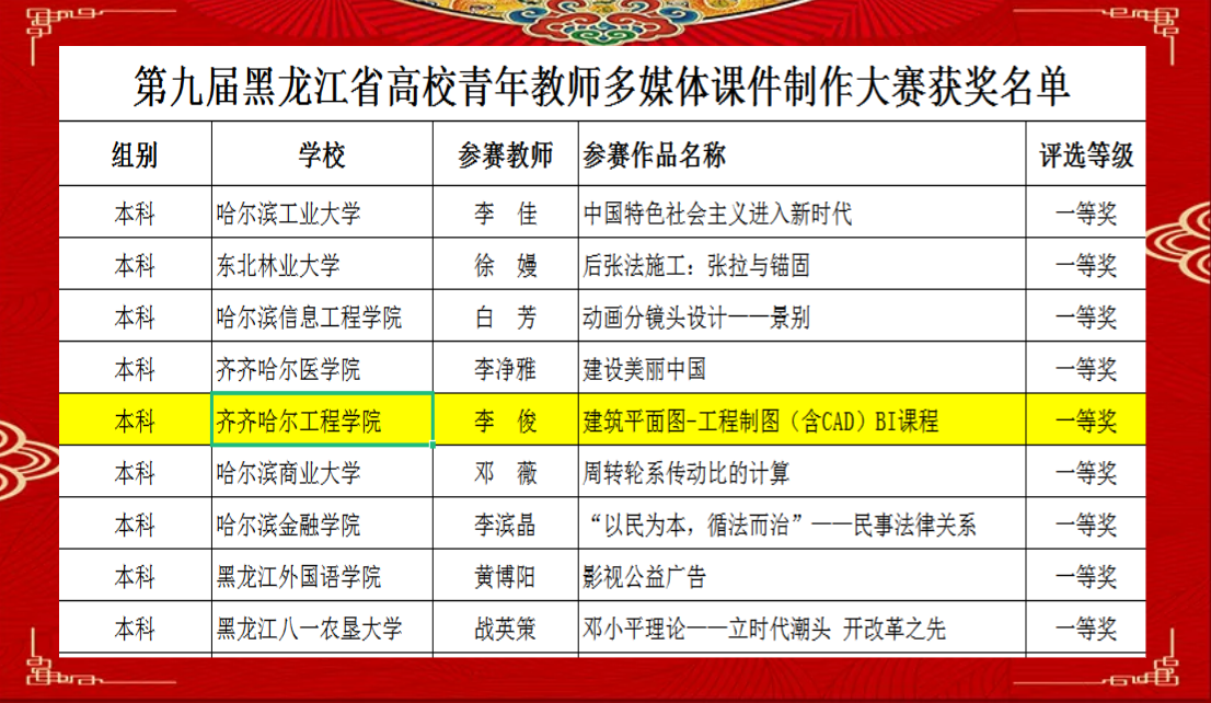 近日,开云官网建筑工程系教师李俊在第九届黑龙江省高校青年教师多媒体课件制作大赛中荣获本科组一等奖。