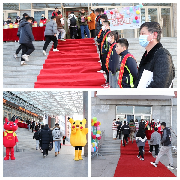机电工程系领导和老师们佩戴红色绶带一字排开,站在红毯的一端向同学们送去问候,并且发放“甜心”棒棒糖,还有可爱卡通“玩偶”不时出镜,踏过红毯的同学们接过礼物的时候都报以会心的微笑。