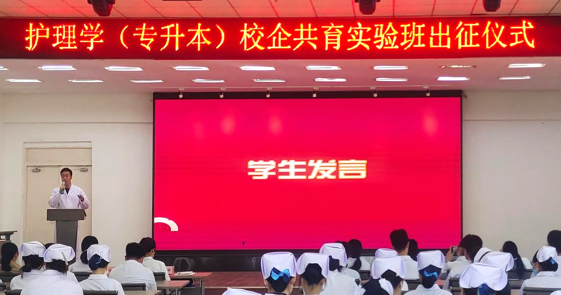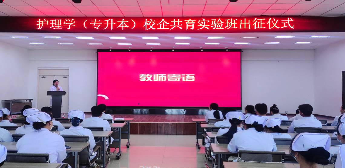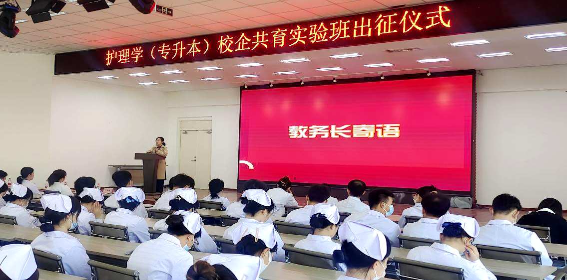 4月9日上午,健康与护理系护理学(专升本)专业校企共育实验班出征仪式在二号教学区2508学术报告厅举行。教务长张静,健康与护理系负责人郭玲玲、教学工作副主任张林琳、学生工作负责人姜宏伟、护理学(专升本)2022级学生辅导员米新及专业教师参加,该专业负责人单大海主持。