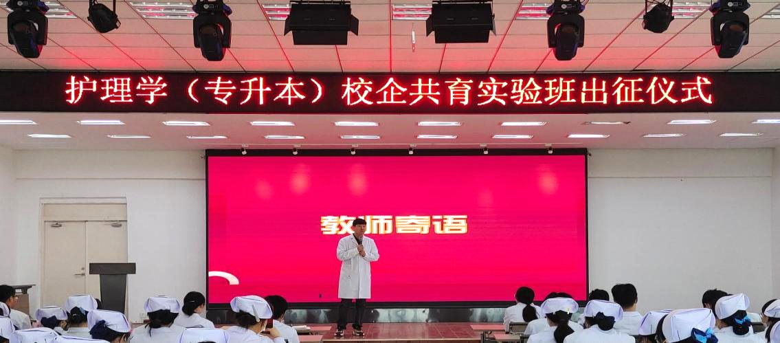 教务长张静肯定了护理学(专升本)专业对校企共育实验班筹备工作,以及通过职业教育的三个“融合”,即职普融通、产教融合、科教融汇所做的努力指出本次实践是顺应现代职业教育体系建设改革的重大举措,以一篇作文《勇气》,鼓励护理学(专升本)专业首批校企共育实验班学生所做的人生选择。张教务长提出三点要求:一是要提高部门领导和教师的思想认识,以此次活动为契机,做好横向课题开发、教师挂职锻炼等各项工作;二是教师自身要进一步明确目标,在做好校企共育工作基础上,及时发现问题,查找不足,挖掘典型案例,持续改进;三是学生要强化自身双重身份,并以“四会”为标准,即学会做人、学会共处、学会学习、学会创造,严格遵守学校和医院管理制度,做好由学生向“职业人”的转变。张教务长希望在校企双导师的带领下,学生通过职业化的学习和塑造,树立健康的职业观与职业道德意识,养成良好的职业习惯;通过企业生产实践,掌握过硬的职业技能本领,提升核心竞争力,为以后就业拓宽渠道。