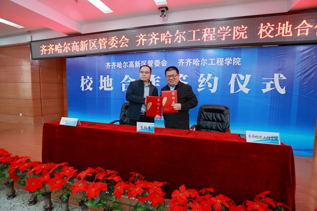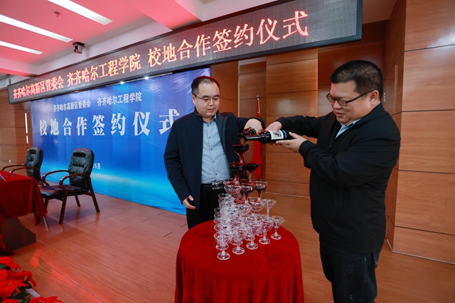仪式上,副院长张振笋和管委会副主任杨冰分别代表学校和齐齐哈尔高新区管委员签署校地合作协议。