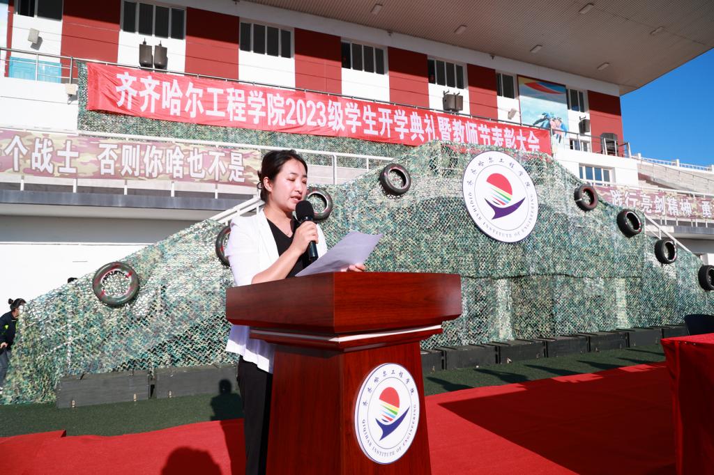 信息工程系计科232班蔡依琳同学代表新生发言,表示通过此次军训活动,身心得到了锻炼,增进了同学之间的感情,要把爱国热血融入学习、生活之中,铸就无悔青春,向时代交出一份合格的答卷。
