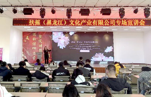 扶摇(黑龙江)文化产业有限公司是齐齐哈尔市梅里斯区劳动就业局推荐并带领下进校开展宣讲会,该公司是当地政府扶持和重点关注的企业。