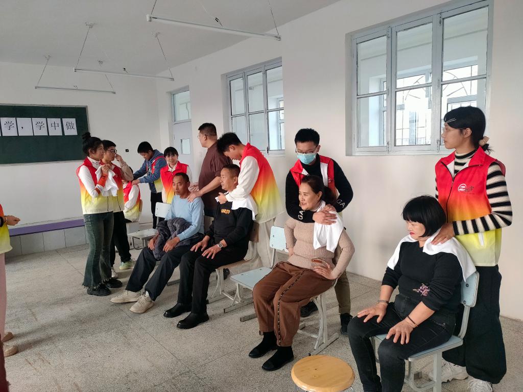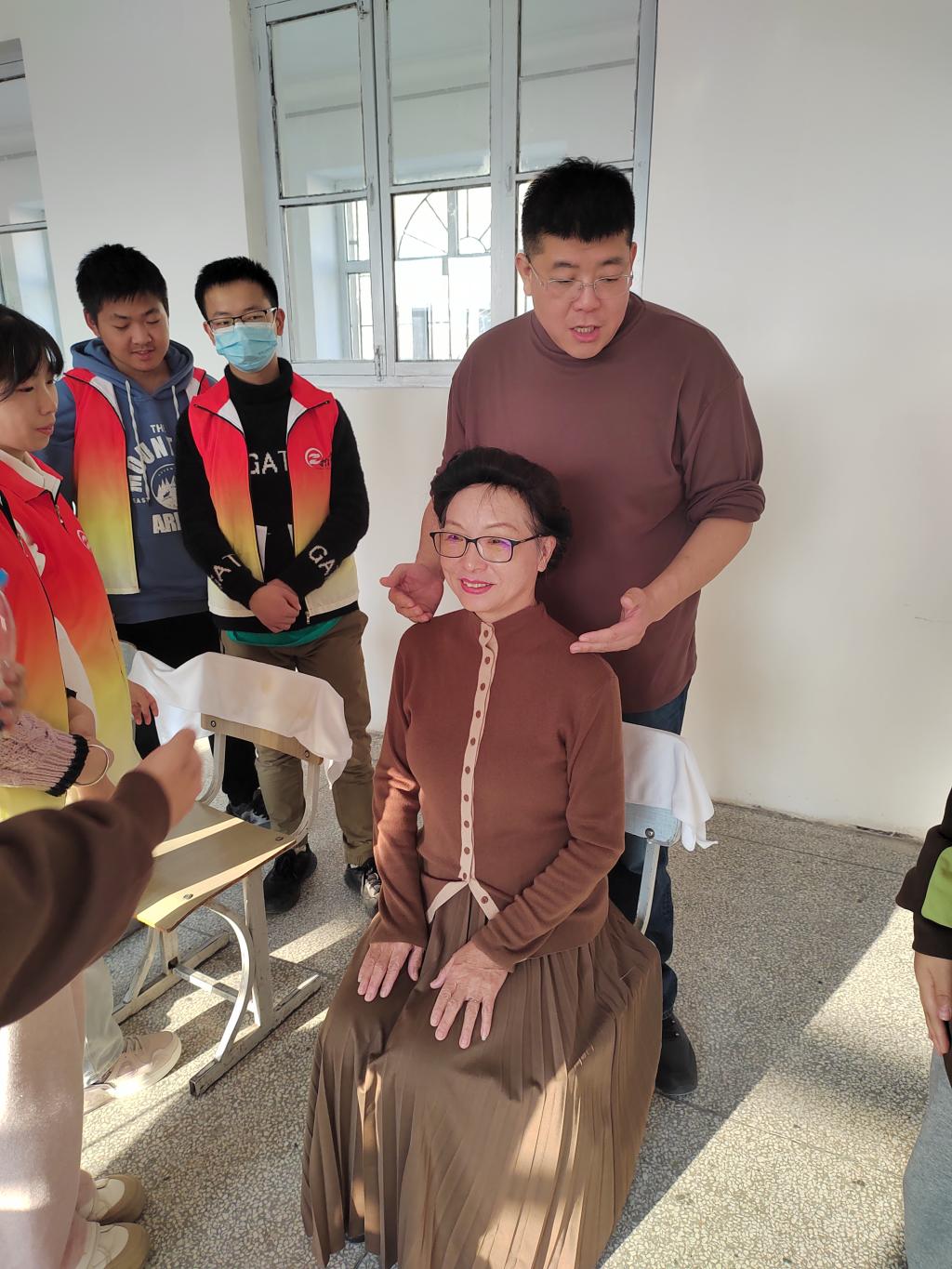 随后,创业团队的学生与老年大学的学员进行了热烈的互动,就保健、养生方面的知识进行展开了深入的探讨,引导学员通过推拿理疗来改善身体健康状况,并现场为老年大学学员进行了推拿理疗,让他们亲身体验到了这一疗法的效果。