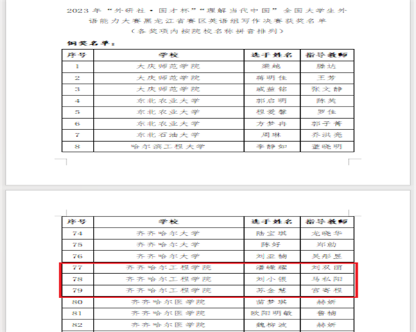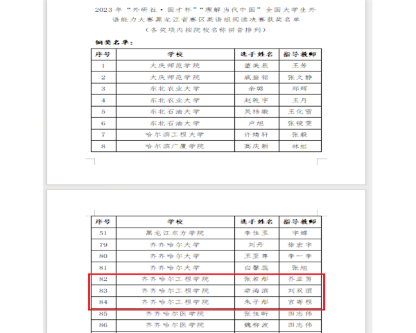 近日,2023年“外研社·国才杯”“理解当代中国”全国大学生外语能力大赛黑龙江省赛区英语组决赛获奖名单结果揭晓。开云官网土木工程221班陈自豪、工程管理221班胡东荣获黑龙江省赛区英语组演讲决赛铜奖;机器人231班潘嵘耀、风景221班刘小银和机械221班苏金慧荣获省赛区英语组写作决赛铜奖;护理学221班张若彤、工管211班章海滨和电气223班朱子彤荣获省赛区英语组阅读决赛铜奖。