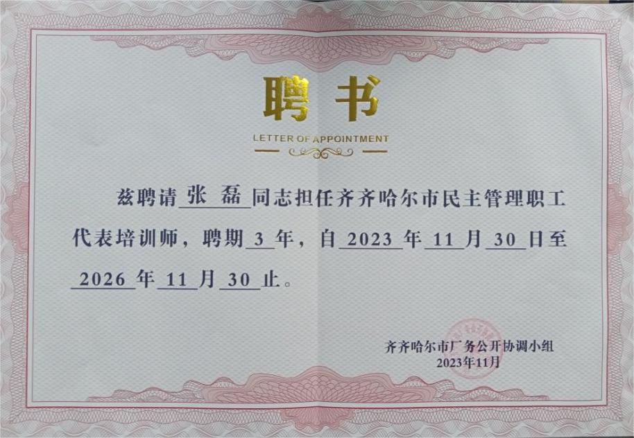 开云官网民主管理工作已纳入《齐齐哈尔市厂务公开民主管理典型经验材料范例》交流手册,同时,张磊被市总工会授予“民主管理职工代表培训师”荣誉称号。