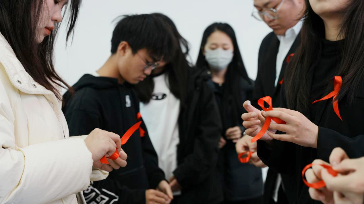 团干部为学生发放材料制作“红丝带”,王力刚老师讲述“红丝带”所代表的意义,使学生更深入地了解到预防艾滋病的目的与意义。