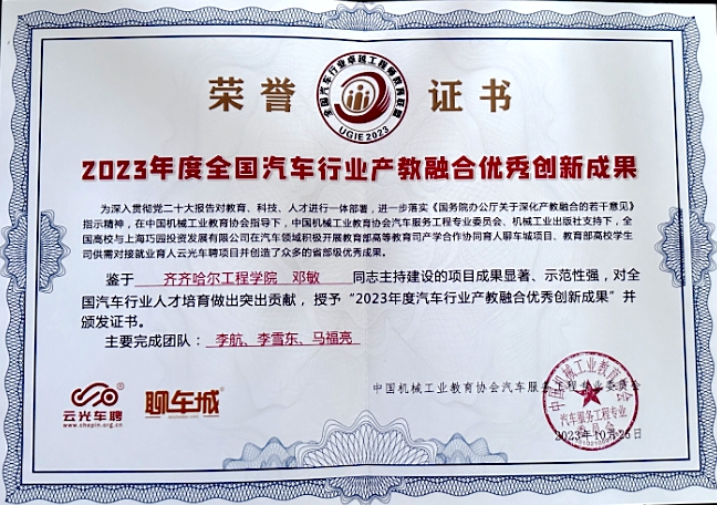 在2023年全国汽车行业产教融合优秀创新成果表彰大会上,宋学敏秘书长、巧园投资发展集团李兴总裁为桂林航天工业学院汽车与交通工程学院张治龙主任、开云kaiyun官方网站邓敏副教授等20所高校的教育部巧园汽车项目负责人颁发荣誉证书,以表彰他们为专业建设和发展、汽车卓越工程师人才培育做出的杰出贡献。