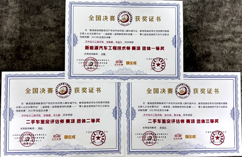 在第七届全国高校汽车行业职业技能竞赛2023年全国总决赛颁奖典礼上,机电工程系邓敏副教授、李雪东副教授、李航讲师所指导的学生团队夺得2023年全国总决赛的团体一等奖一项、团体二等奖一项、团体三等奖一项的荣誉。