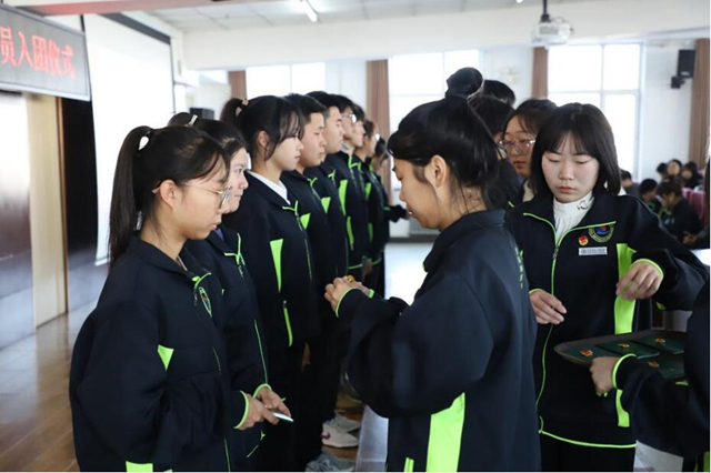 老团员干部代表为全体新团员佩戴了团徽,在团干部张思远的带领下,全体新团员庄严宣誓,老团员重温入团誓词。新团员们昂首挺胸,团徽在胸前闪耀。他们高举右拳,在鲜艳的团旗下,许下庄重的誓言。