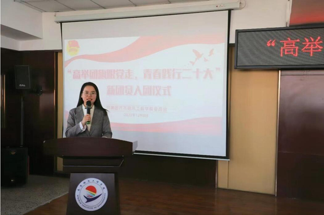 校团委指导教师张云惠代表学校团委对新发展的团员表示热烈祝贺,并对新团员提出要求。她表示,同学们有幸生活在一个伟大的时代,在这个时代里,青年肩负着重大的责任和使命,希望同学们能侧耳聆听,响应召唤,在奋进中破难题、补短板,在奋发中敢创新、求突破,争做一名优秀的共青团员,把自己锻造成堪当民族复兴大任的新一代青年。